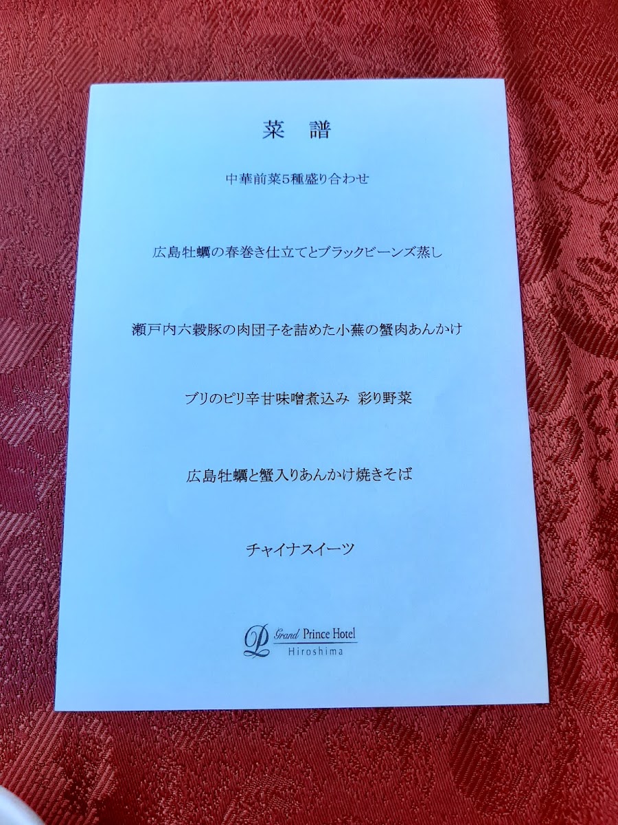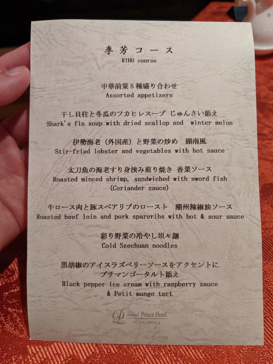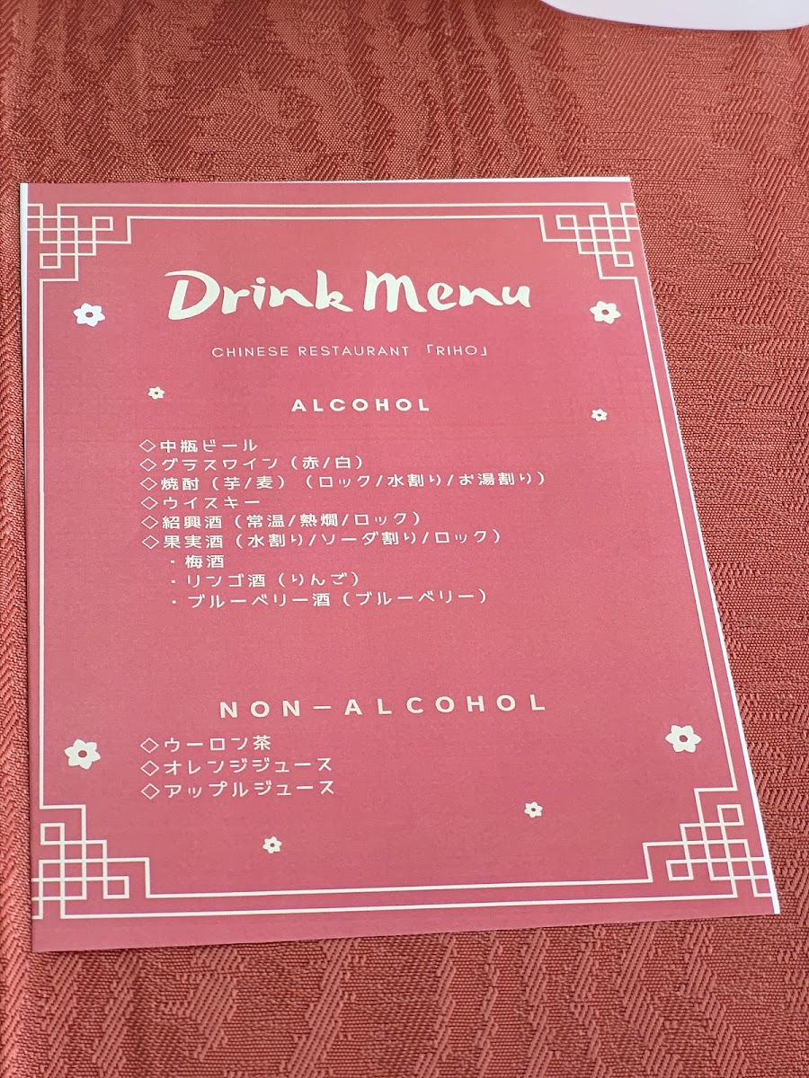 The menu at Riho Chinese Restaurant offers a refined and diverse selection of dishes that showcase the rich flavors of Chinese cuisine with a Japanese twist. Among the standout options is the Shark's Fin Soup with Dried Scallop and Winter Melon, a luxurious, rich dish that combines delicate shark’s fin with the sweetness of winter melon and the depth of dried scallops. Another highlight is the 秋の味覚蒸籠蒸し 発酵海老味噌ソース, a seasonal dish featuring steamed autumn vegetables, enhanced by a flavorful fermented shrimp miso sauce, adding a bold, umami-packed finish. The 一口中華前菜3種盛り合わせ is perfect for those who enjoy variety, offering a delightful trio of Chinese appetizers that tease the palate with their fresh, distinct tastes. Lastly, the 山芋の瀬戸内六穀豚捲き 中国黒酢ソース features tender rolls of Setouchi six-grain pork wrapped around yam, all drenched in a rich Chinese black vinegar sauce that provides a sharp contrast to the savory meat. Together, these dishes reflect the restaurant’s commitment to serving high-quality, innovative Chinese fare with a Japanese touch, making it a must-visit for those seeking an exceptional dining experience.